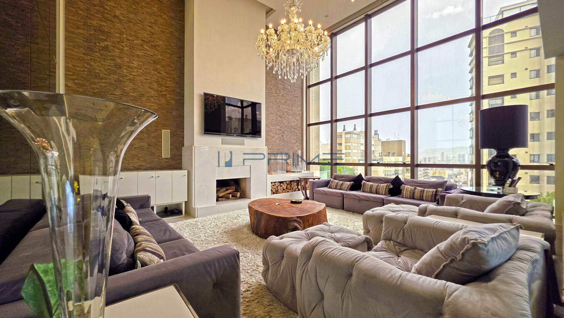 O living com pé-direito duplo e lareira confere charme e exclusividade ao ambiente, integrado ao espaço gourmet com churrasqueira — perfeito para receber com requinte. A vista panorâmica, aliada à excelente ventilação, proporciona uma atmosfera única.