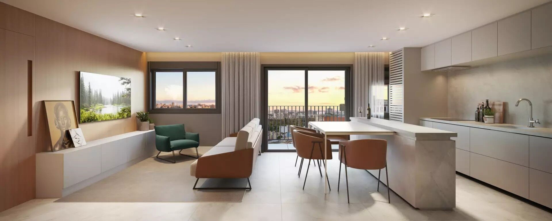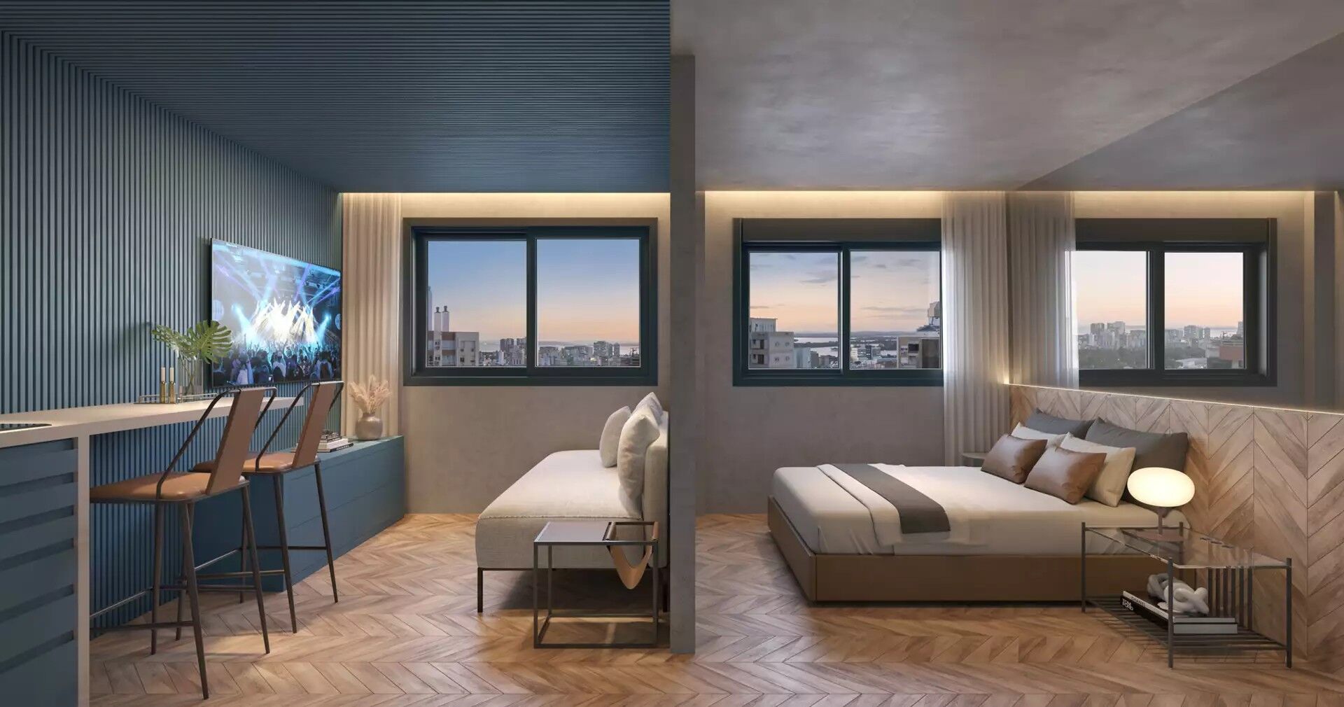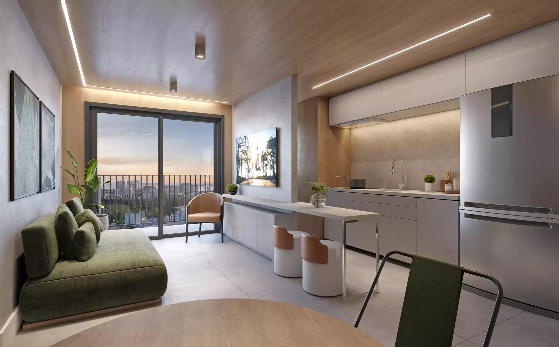 Studio com 28m² de área privativa, desenvolvido com planta inteligente e versátil, que permite a configuração de 1 dormitório com suíte ou dormitório integrado ao living, adaptando-se perfeitamente a diferentes estilos de vida.
